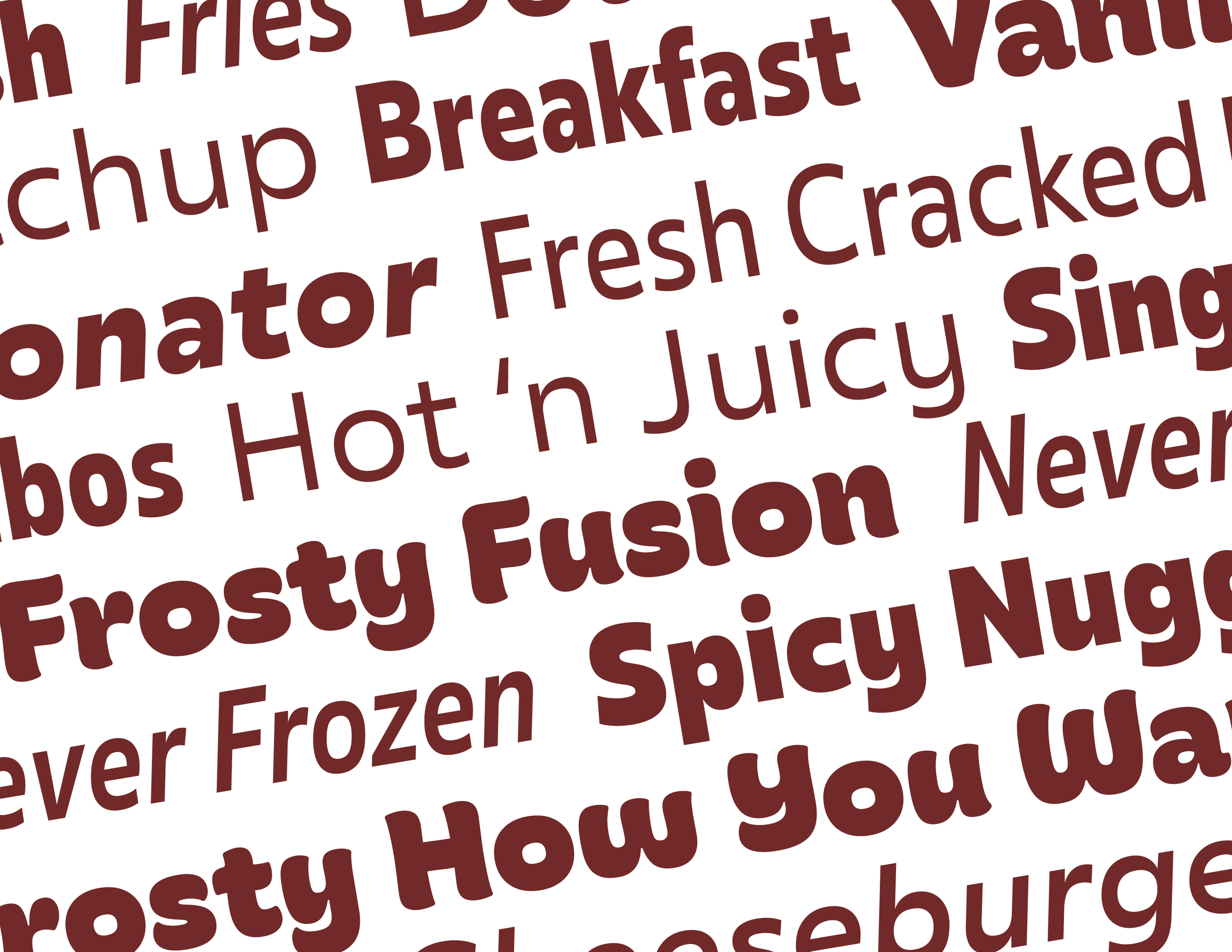 Partnered with Dalton Maag, a London type foundry, to craft a robust semi-custom font family for Wendy’s. Together we developed two unique typefaces—Fresh and Frosty—each rooted in the brand’s heritage and sprinkled with playful “easter eggs” of Wendy’s personality. On a tight timeline, we reimagined Objektiv into a versatile, squared-off sans that nods to Wendy’s square patties and Frosty swirls, resulting in a flexible typographic system that’s equal parts functional and cheeky.